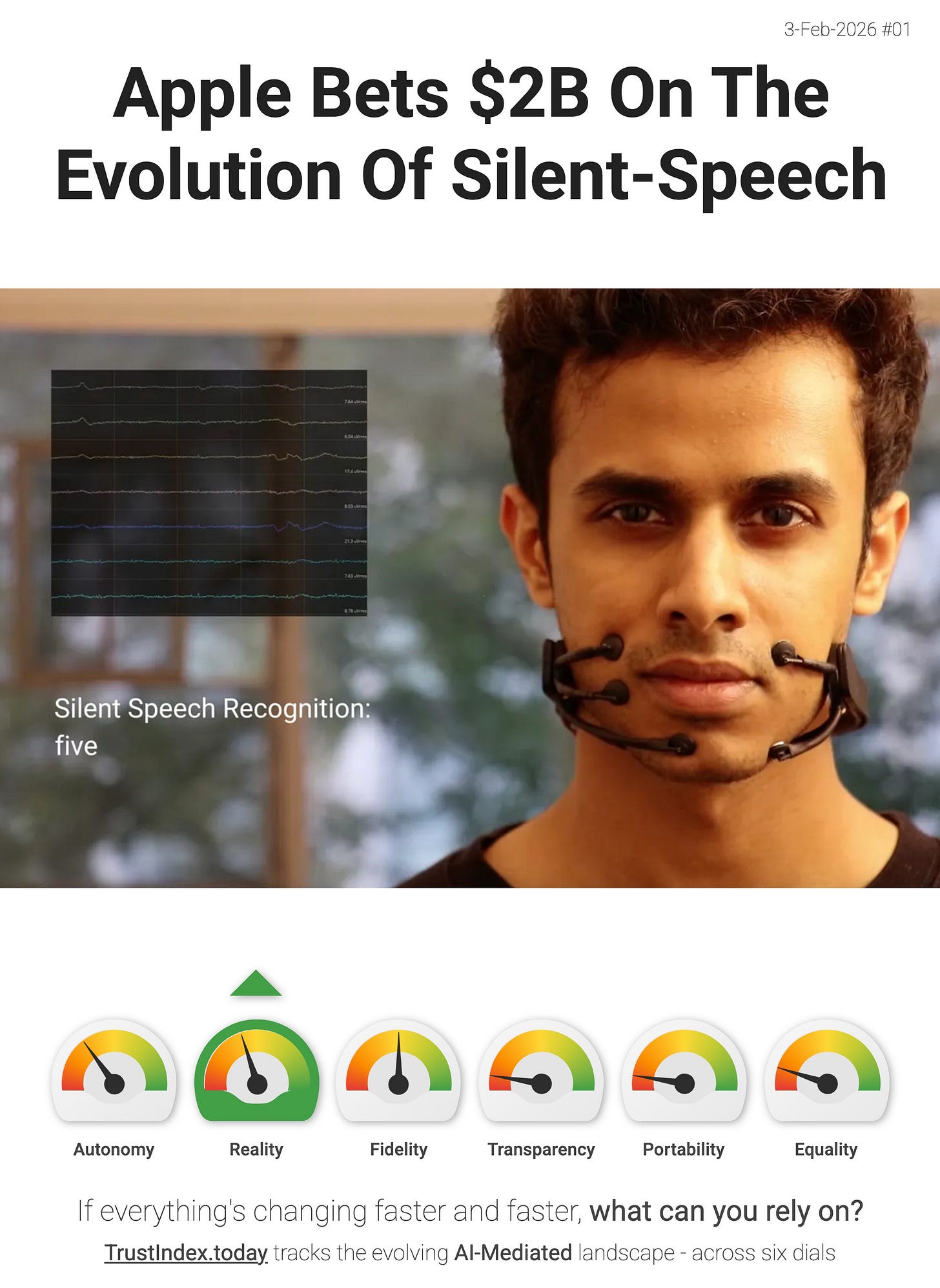 Apple has reportedly made a ~US$2B bet on “silent speech” - acquiring q.ai, who uses optical tracking of tiny facial micromovements to infer what you’re saying without audible speech.