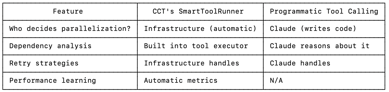 Key difference: The CCT agent’s approach makes the infrastructure smart. The agent doesn’t have to think about parallelization - SmartToolRunner analyzes dependencies and executes optimally automatically. Programmatic Tool Calling makes Claude responsible for writing parallel code.