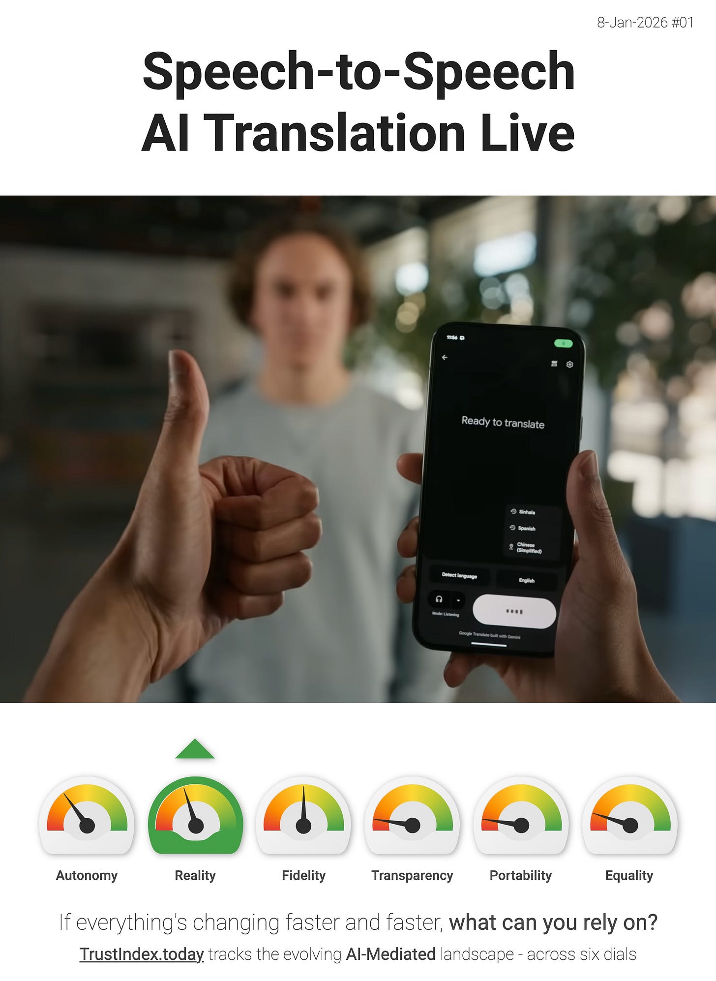 This is upward pressure on the Reality dial. When translation moves from “a thing you do” to “a layer you wear”, the AI starts sitting “between you and other people’s conversations” - filtering, re-timing, and re-voicing what you perceive in real time. Google explicitly claims the experience works to preserve “tone, emphasis and cadence”, making the mediated layer easier to accept as the default interface for live interaction.